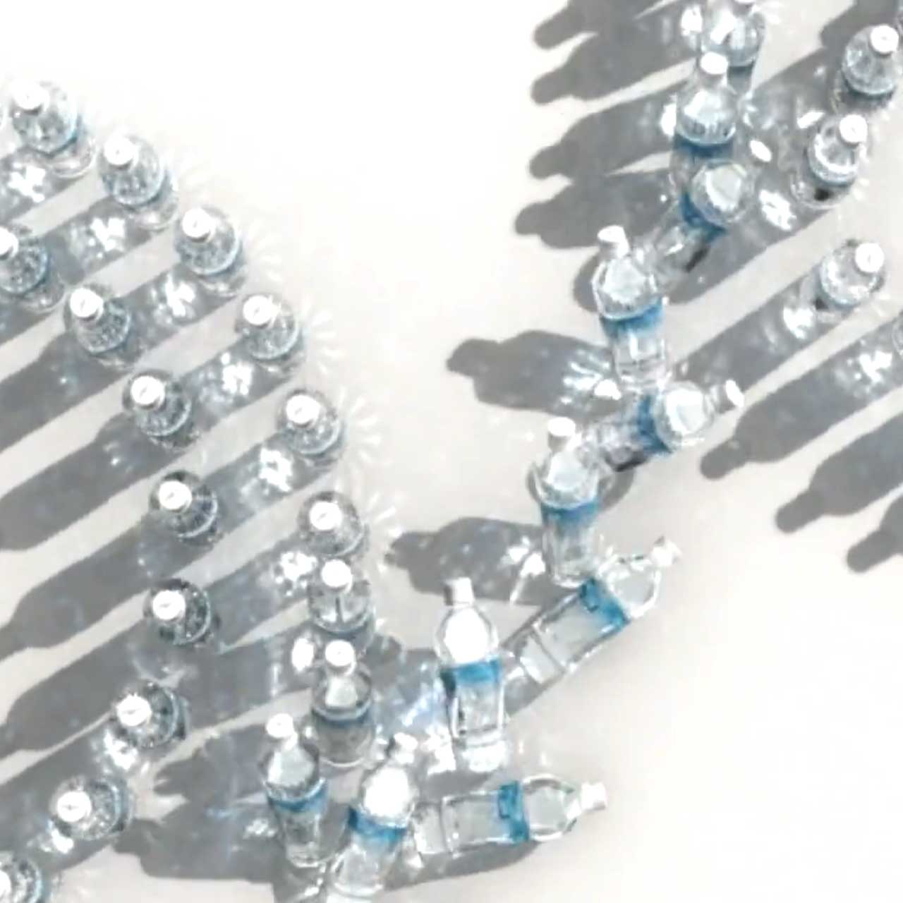 In the example of the advertisement for mineral water from the company DyDo Group Holdings, AOKIstudio made a number of proposals before settling on just one idea: to stage the DYDO water bottles like dominoes in a playful and surprising world made up entirely of water bottles.